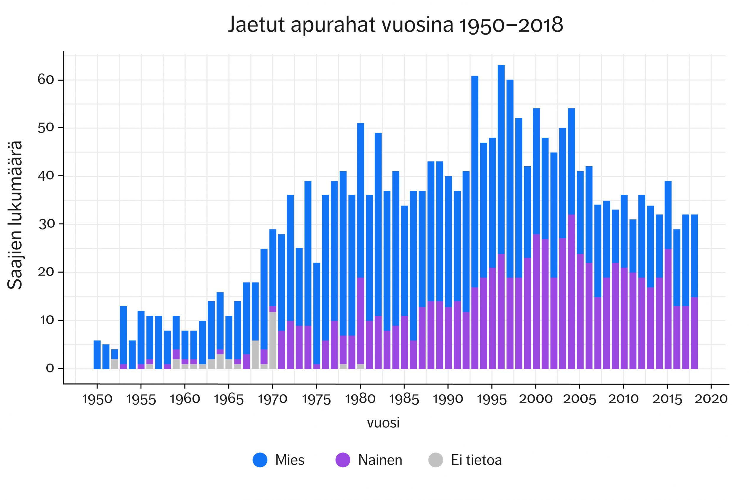Kuvio osoittaa, että naisten osuus rahoitusta saaneista tutkijoista kasvoi hitaasti 1970- ja 1980-luvuilla ja vähän nopeammin 1990-luvin puolivälin jälkeen, kun säätiö oli siirtynyt pois Alkosta ja tullut itsenäiseksi valtion säätiöksi. 2000-luvulla naisia on ollut noin puolet tai enemmänkin säätiön vuosittain rahoittamista tutkijoista. Saatuja rahoitussummia koskevat tiedot eivät osoita, että summien suuruus olisi yhteydessä hakijan sukupuoleen. (Linkki Kuvioliitteeseen).